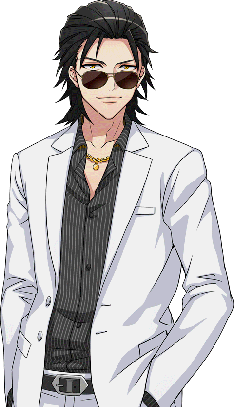 Ichiro is a tall man with sliced back black hair and golden eyes.